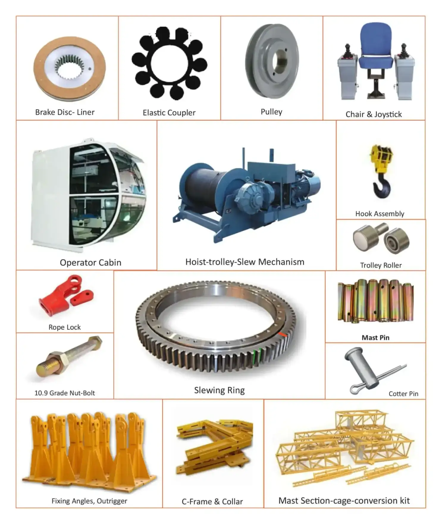 We offer a wide range of spares for various models such as tower, derrick, passenger hoists, and luffing cranes.